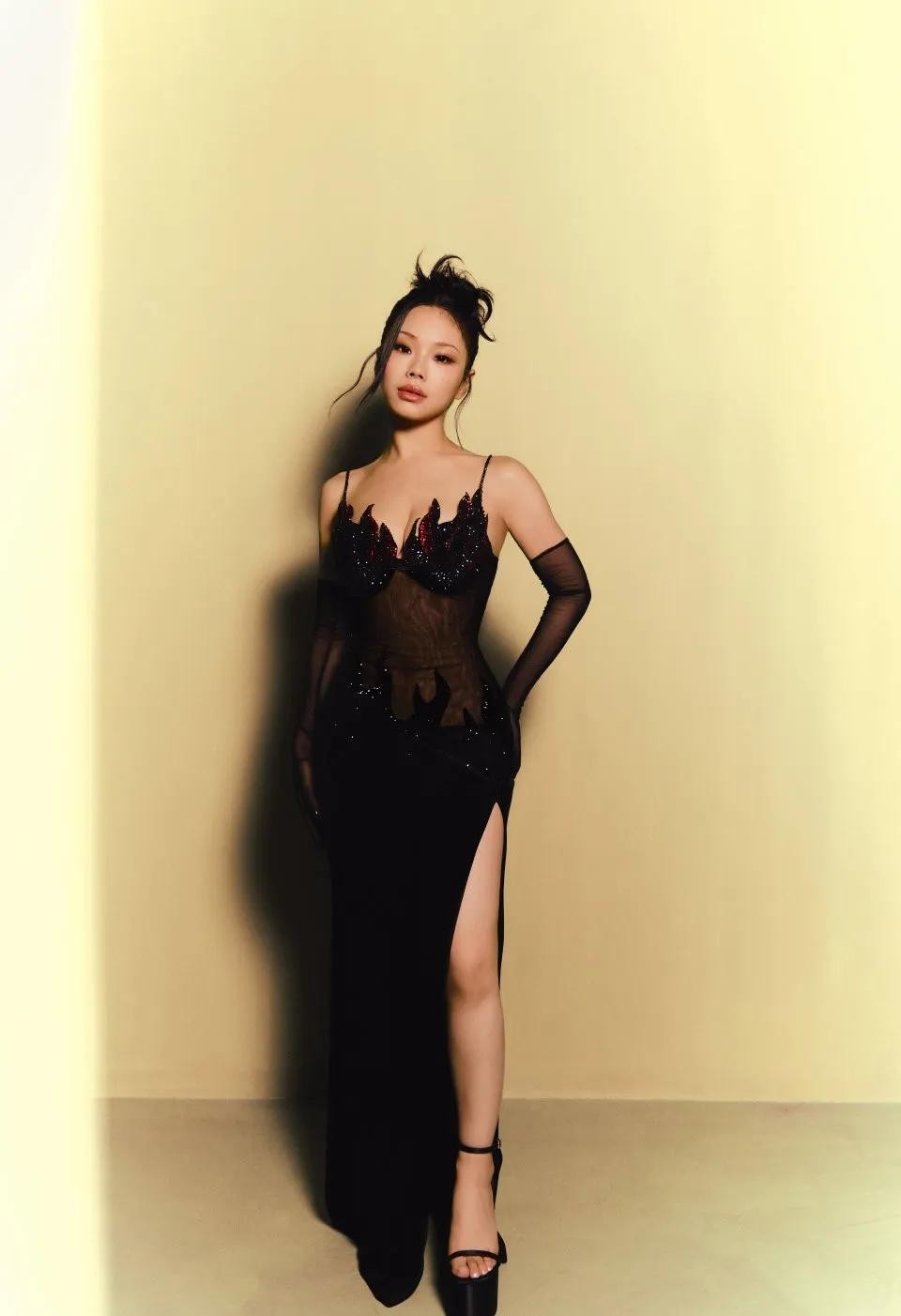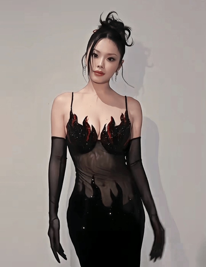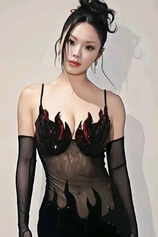 黑色透视的火焰长裙,搭配着黑丝手套。紧身的长裙紧贴着她那傲人无比的曲线,网友直言火辣程度10颗星。小米辣对上姐姐都是小趴菜。