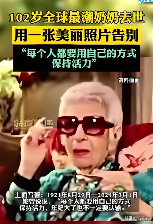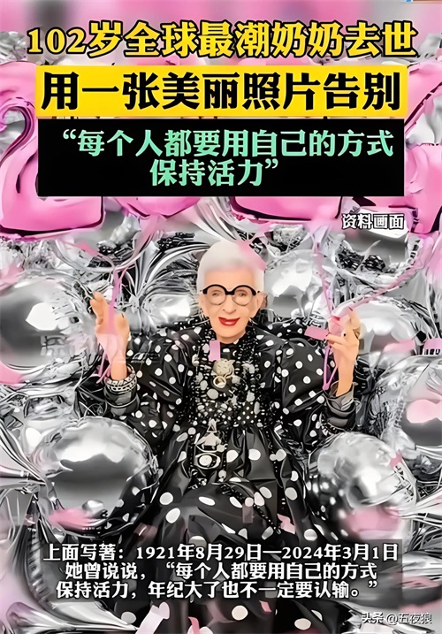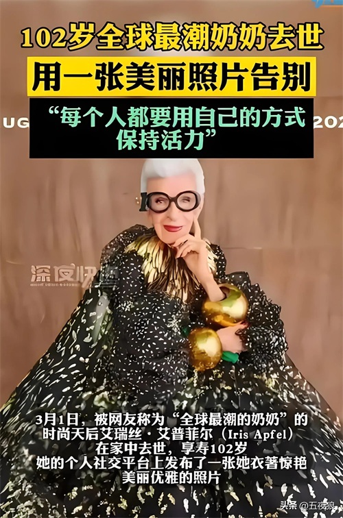传奇时尚偶像Iris Apfel星陨,享年102岁!天呐!听到这个消息,全球时尚圈都震惊了!那位总是以惊艳造型亮相、让人眼前一亮的“全球最潮奶奶”Iris Apfel竟然去世了!享年102岁的她,用一生诠释了什么是真正的时尚精神!
