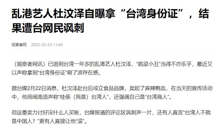 观察者网2022—02—23乱港艺人杜汶泽自曝拿“台湾身份证”,结果遭台网民讽刺
