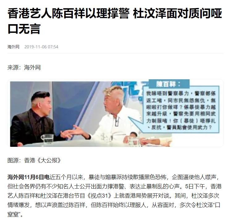 海外网2019—11—06 香港艺人陈百祥以理撑警 杜汶泽面对质问哑口无言
