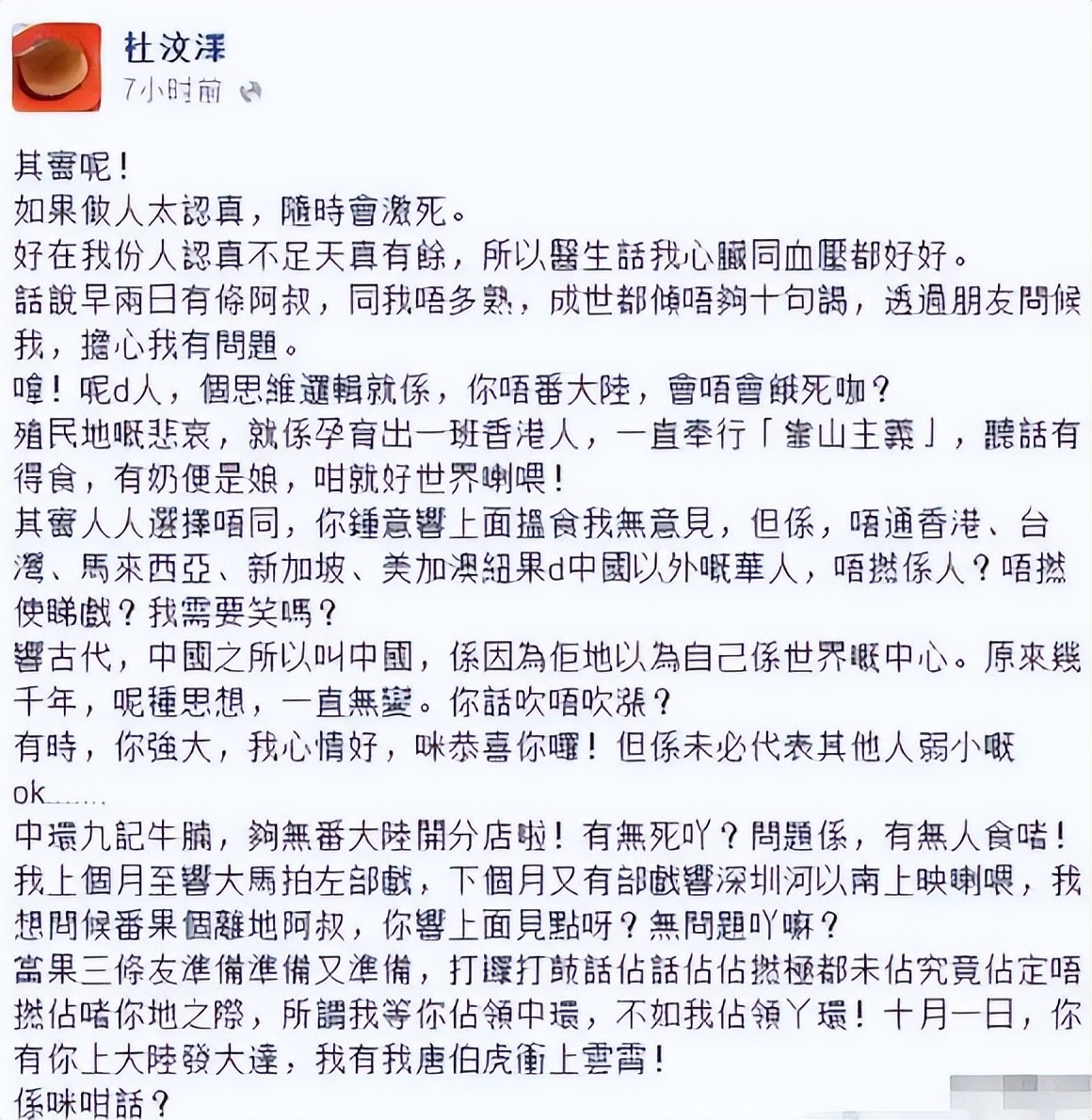 在社交平台上公然抹黑内地,还对自己的朋友忘恩负义,“乱港艺人”杜汶泽有如今的下场,也是自作自受。