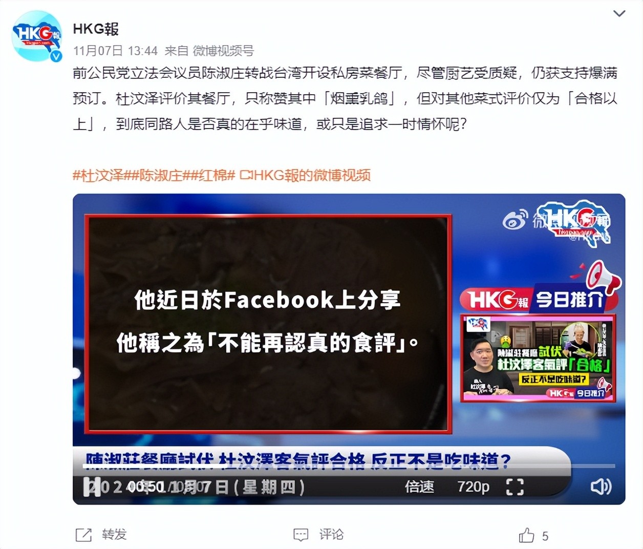 不过,台湾民众的看法,并没有影响到他的生活,就在今年11月,有媒体爆料出,杜汶泽今日在社交平台分享了自己品尝美食的帖子,并表示这时“不能再认真的食评”。