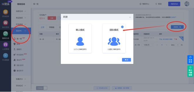 点击“新建摇一摇”选择“团队模式”并进行游戏轮次设置