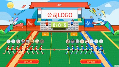 4.拔河:一款团体性的互动游戏,用户通过扫码进行选择分成两组,游戏开始后通过不断的摇手机进行参与,屏幕上会以拔河的形式展示两队的成绩。