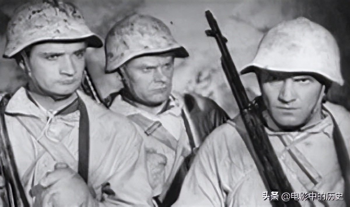 接下来是《深入敌后》(В тылу врага ,1941,苏联)。这部影片制作于苏联卫国战争前夕,上映时恰逢卫国战争爆发和苏军溃败的时期。影片主要讲述苏芬战争期间,侦查员沃伊科夫(Voikov)带领情报人员潜入敌人后方执行任务的故事。影片通过描绘敌后斗争,提高了观影群众的士气。需要注意的是,影片中苏军佩戴的是当时装备的M1940型钢盔。