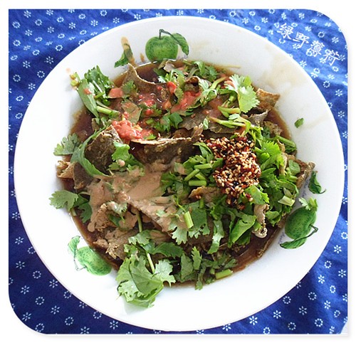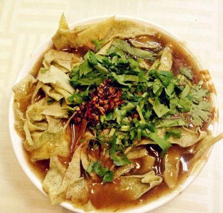 绿豆、大米洗净,用水浸泡至回软,上磨磨成糊状,用铁鏊摊成极薄的煎饼,切成柳叶条形。锅内加花生油烧热,加入葱花、姜末、香菜段爆香,上大料粉、面酱炒熟,倒入酱油烧开,再加盐水、五香粉、碱面煮开,用湿淀粉勾成卤汁。