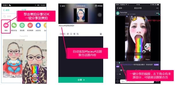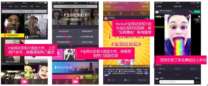 1月8日,Faceu双平台完成接入美拍开放平台,用户可以轻松地将制作好的视频文件一键美拍,并且可以在美拍视频左下角中显示视频来源。1月15日,Faceu在美拍举办了一个名为#全民吐彩虹#的互动活动,邀请用户点击下载Faceu,录制一段“吐彩虹”的视频,然后美拍参与活动。此外,美拍为Faceu的活动页开放了站内直接跳转下载Faceu的权限,保证活动的流畅性,还将活动加入热门信息进行推广,并给予一系列资源协助,比如在美拍应用内进行app推荐、活动推荐等。一时间,美拍满屏都是彩虹。