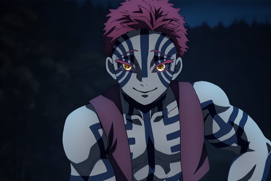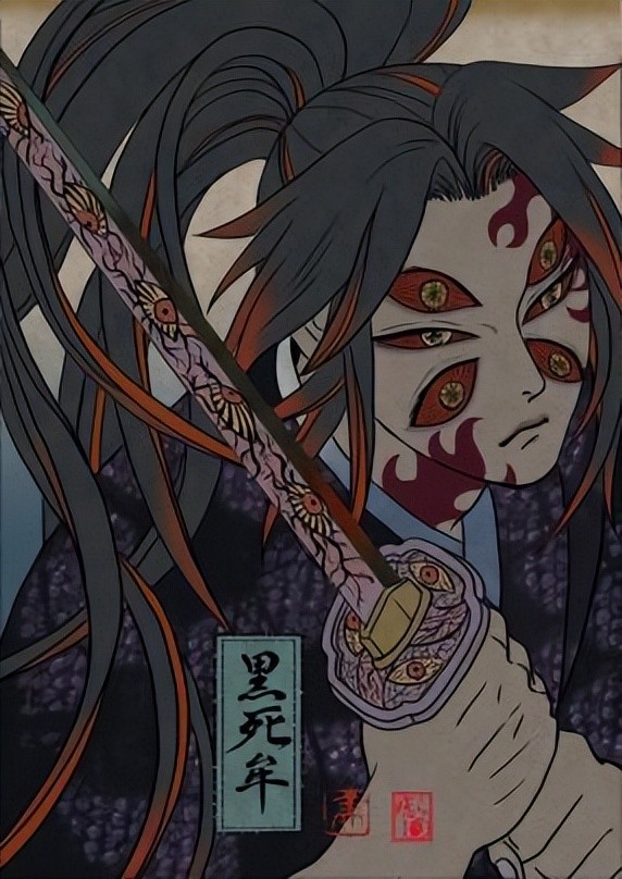 剑士模样,六目,左额有火焰状的疤痕。阶级观念强,不容上下秩序混乱。在上弦聚首中因看不惯猗窝座的越级作风,而斩断其一条手臂。
