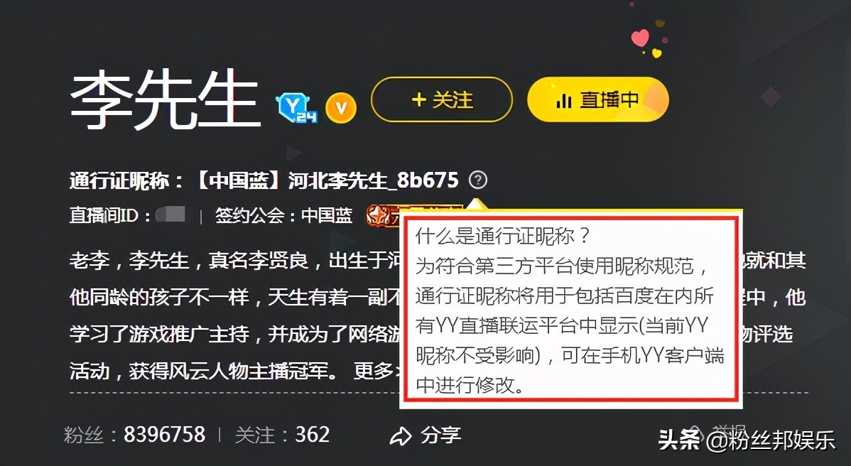 除了这些,可能有细心的YY粉丝发现,最近YY主播们的个人主页上,突然多了一个“通行证昵称”。