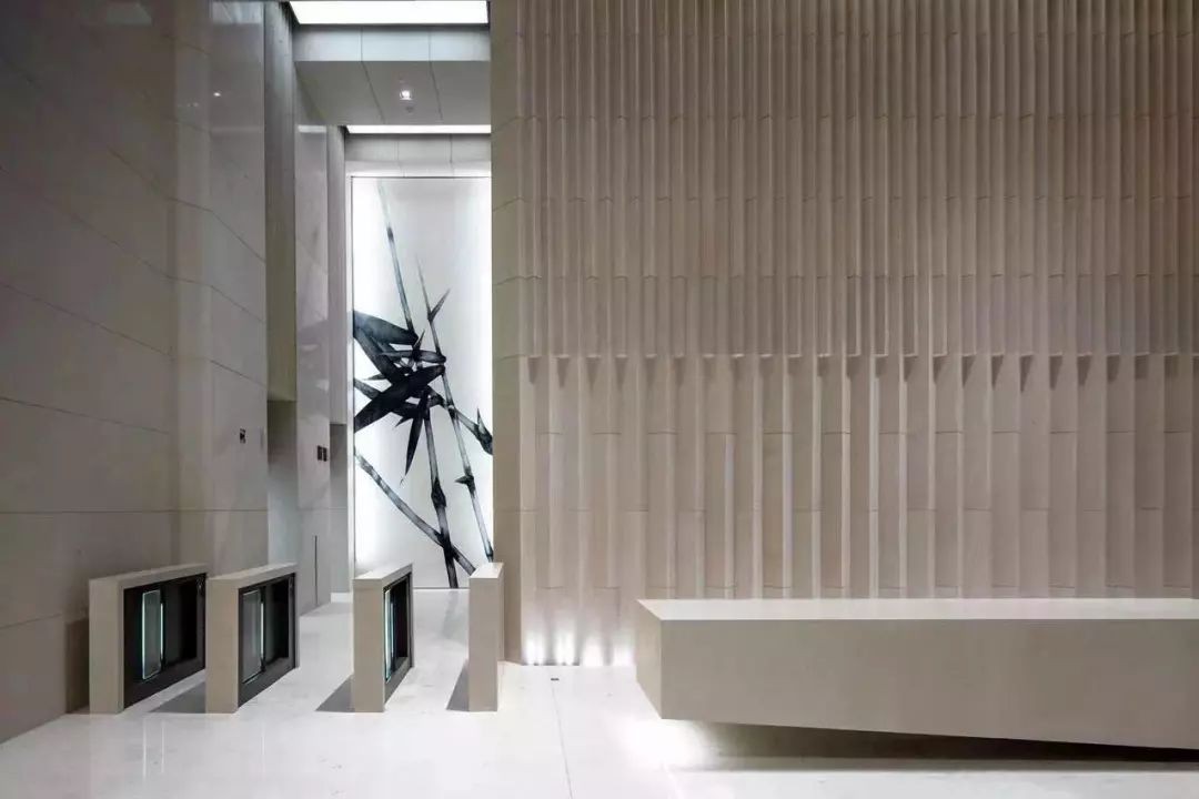 大堂内竖线条的壁饰与建筑外体的竖向线条交相呼应。
