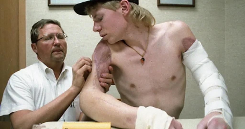 8、美国一位名叫约翰·汤普森的青年,在农场因操作不当,致使自己的双臂被扯在农机中,但他却强忍疼痛用嘴叼笔拨通了急救电话,这也使得他双臂因救治及时而被保住。