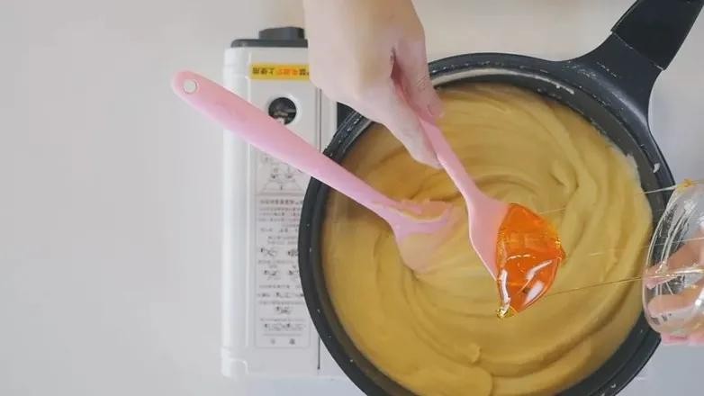 4. 锅中放入绿豆泥,分次加入玉米油和细砂糖,开小火开始翻炒。