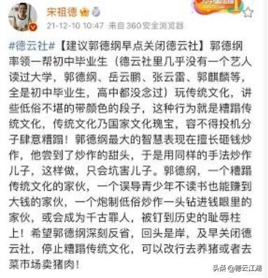 12月10日,宋祖德发文声称:“郭德纲率领一帮中小学毕业生玩传统文化,脱了裤子取悦观众,讲些低俗不堪的段子侮辱观众的耳朵,这是糟蹋传统!郭德纲最大的智慧就是擅长砸钱炒作,还用同样的炒作手法去炒作儿子郭麒麟,误导青少年不读书也能赚到钱,这是千古罪人,早晚会害了儿子!”除此之外,宋祖德还发文预言:“德云社将在2024年前彻底倒闭,如果我预言错了,我愿意从广州爬到佛山市!”此言一出,立刻引起了网友们的热烈讨论。