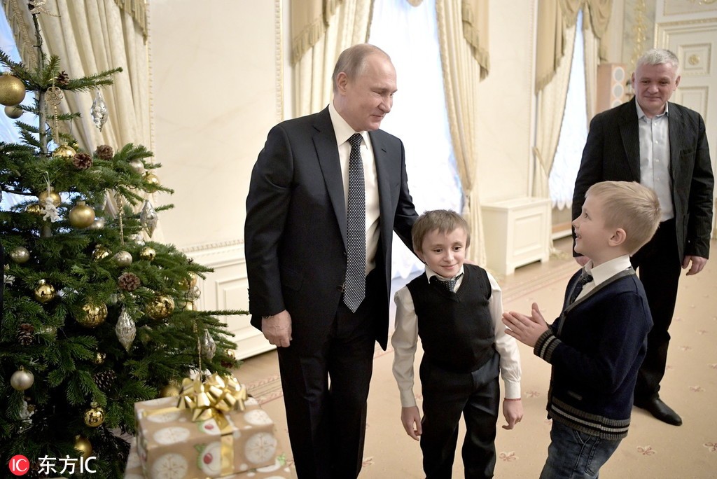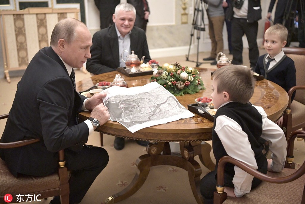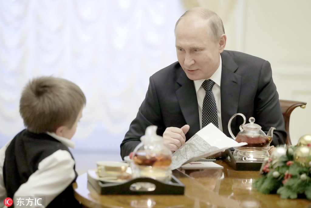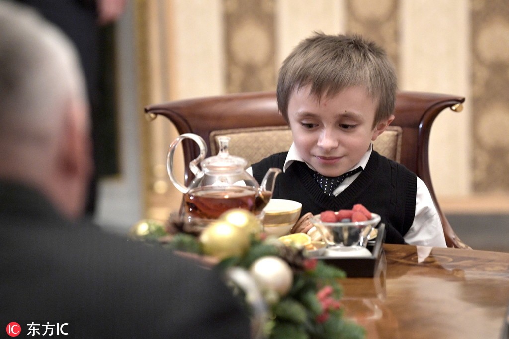 当地时间2018年12月15日,俄罗斯圣彼得堡,俄罗斯总统普京在当地的康士坦丁宫会面14岁男孩Artyom Samuylov。Artyom Samuylov患有脆骨症,在近日的国际志愿者论坛期间,他向普京请求了有机会坐直升机游圣彼得堡。