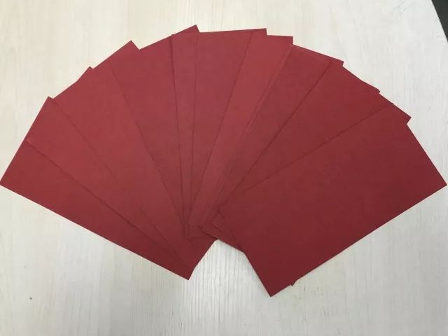 制作步骤:将每张红色卡纸平均裁剪成三个小长方形,4张卡纸共裁成12个小长方形。