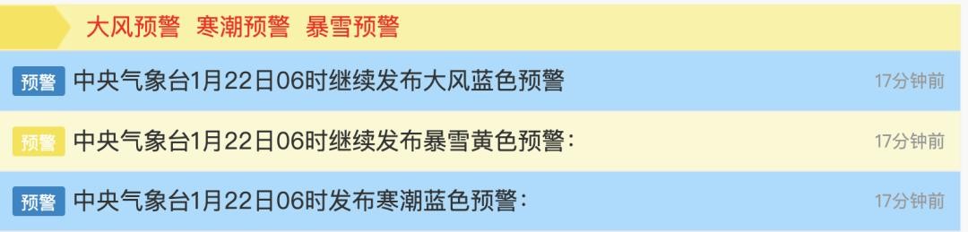 大风蓝色预警:预计,1月22日08时至23日08时,辽宁南部、内蒙古中部、山东半岛、江苏沿海、上海、浙江沿海、福建沿海、广东沿海及新疆南疆盆地和东部、甘肃河西等地有5~6级、阵风7~8级的大风;黄海大部海域、东海大部海域、台湾海峡、台湾以东洋面、巴士海峡、北部湾、南海北部和中部偏北海域将有7~8级、阵风9~10级的偏北到东北风,其中台湾海峡部分海域风力可达9级、阵风10~11级。