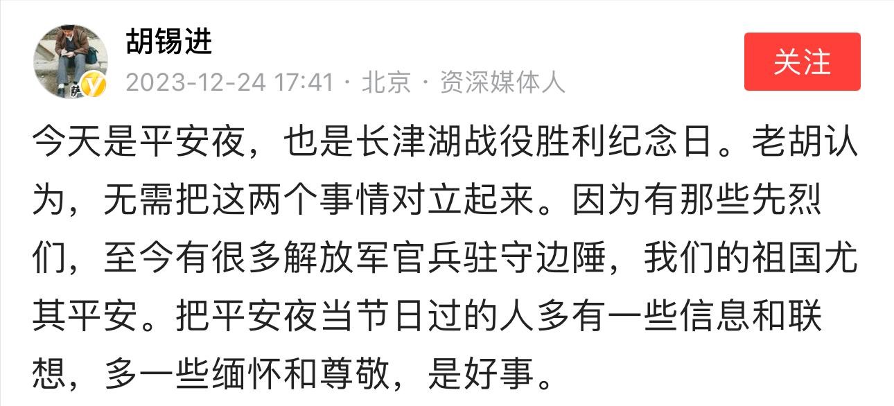 昨天,老胡的一篇文章火了,他认为,平安夜是平安夜,长津湖胜利纪念日是长津湖胜利纪念日,两者并不可对立,国人想过洋节,是他们的正当权利。
