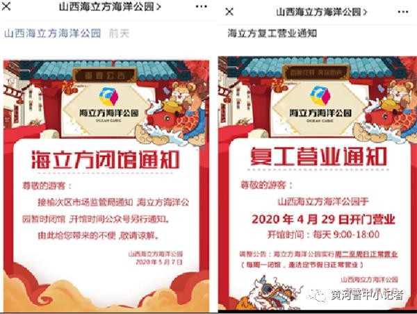 5月7日,山西海立方海洋公园公众号发布公告称,接到榆次区市场监管局通知,海立方公园暂时闭馆,开馆时间公众号另行通知。据海立方公园的营业通知,该公园已经在4月29日开门营业。