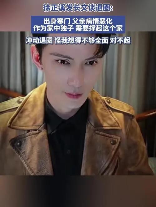 综上所述,徐正溪选择发表退圈声明的原因主要是基于家庭因素和个人情感的考量。他希望通过退圈来更好地照顾病重的父亲和实现家庭和睦的愿望。这一决定虽然令人惋惜,但也体现了徐正溪作为一个有责任感和情感丰富的人的真实写照。