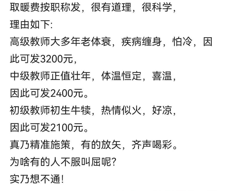 所以,在这个问题上,大家没有必要纠结过多。因为,这么一分析,取暖费的发放基本上还是公平的。