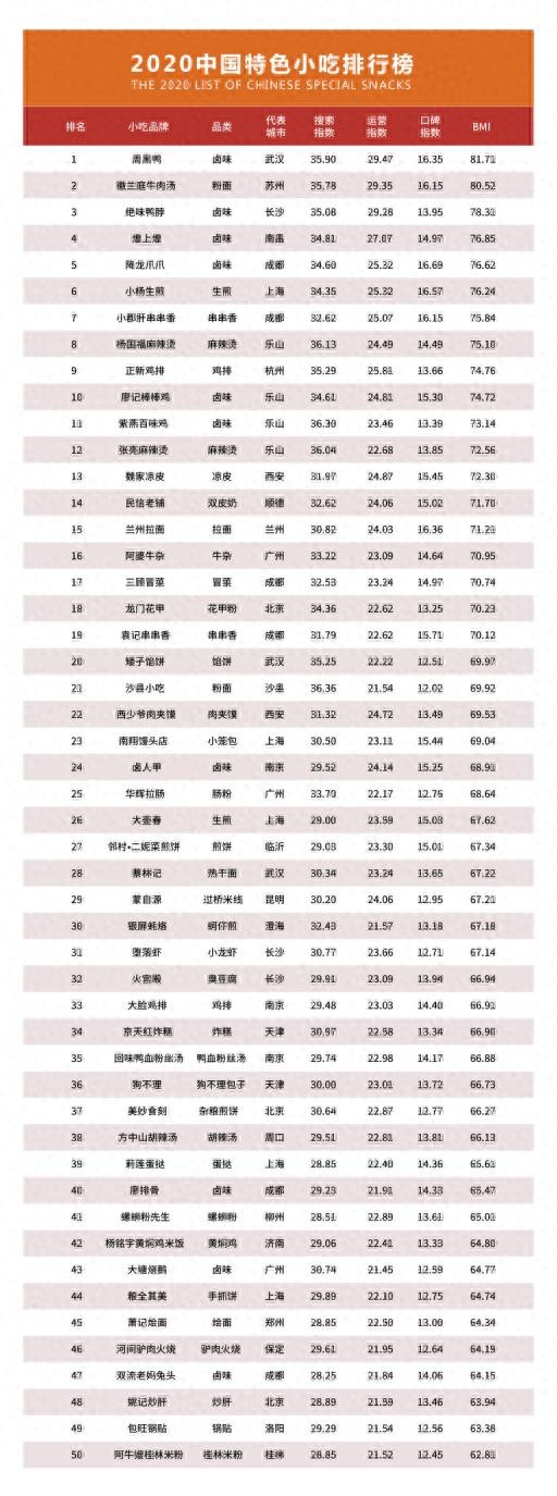 据榜单显示:在2020年度中国特色小吃排行榜中,周黑鸭G-BMI得分81.76排名稳居第一,卤味小吃品类的实力不容小觑。表现比较亮眼的是徽兰庭牛肉汤,是排行榜前5名中唯一的非卤味小吃,在“鸭界三强”周黑鸭(第1)、绝味鸭脖(第3)、煌上煌(第4)中脱颖而出实属不易。榜单前十名还有正新鸡排、杨国福麻辣烫、小杨生煎、小郡肝串串香、廖记棒棒鸡等。以下是榜单详情: