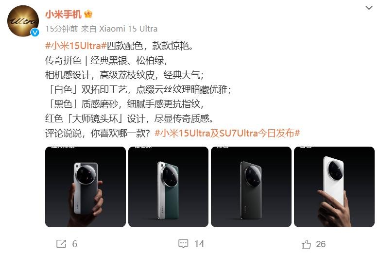 小米手机在官方微博发布了小米15Ultra的四款配色,除了经典黑银、白色、黑色外,新机还提供一款松柏绿配色。