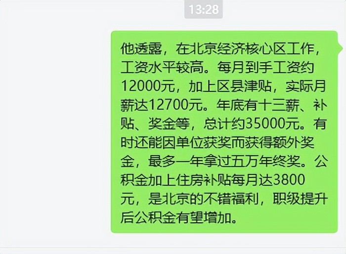 他透露,由于所在区域为北京的经济核心区,工资水平相对较高。每月到手工资约为12000元,加上每季度2000元的区县津贴,实际月薪达到12700元。年底时,还有十三薪、应休未休补贴、奖金绩效等各种收入,总计能拿到35000元左右。此外,在某些年份,如果单位获得文明奖或考核优秀,还能额外获得一万多的奖金,最多的一年甚至拿到了五万的年终奖。