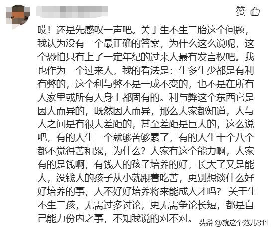 看了网友的建议,你还在考虑生二胎吗?在做出决策之前,一定要全面评估个人和家庭的实际情况、经济状况等因素。