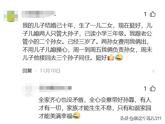 儿子结婚己十年,生了一儿二女,现在挺好,儿子儿媳两人只管大孙子,己读小学三年级。我跟老公管小的两个孙女,已经三岁了。两孙女费用我俩出,不用儿子儿媳操心,周一到周五我俩负责孙女,周未儿子他接回去三个孙子同住。挺好。
