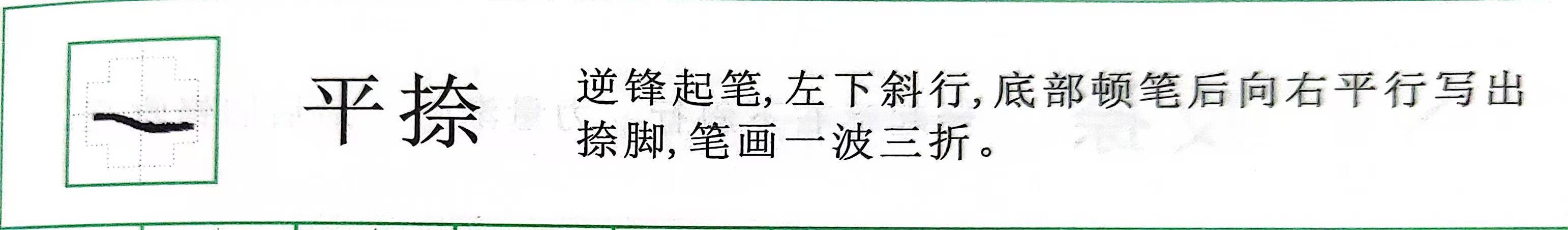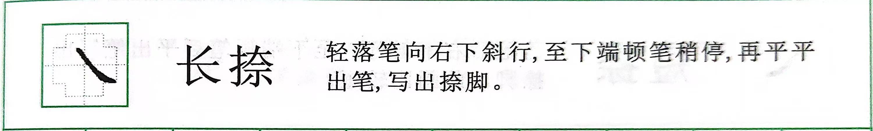 长捺:轻落笔向右下斜行,至下端顿笔稍停,再平平出笔,写出捺脚。