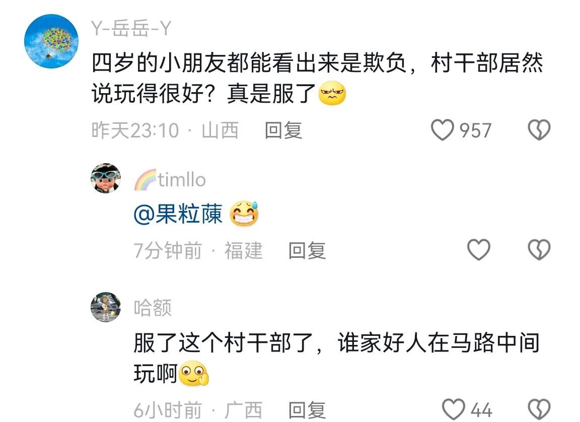 其次,老人跟小朋友玩的很好,这为村官是没看视频还是怎么的?在马路中间玩?拉倒在地也是玩?