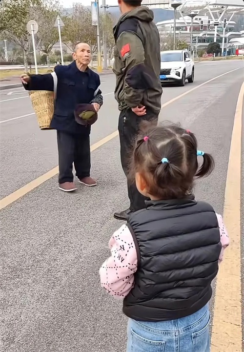 此时,另外一名男子正在给老人捡起掉落的矿泉水瓶,并关心着老人的举动,当有汽车靠近时,直接把老人拉住,生怕老人遭遇危险。