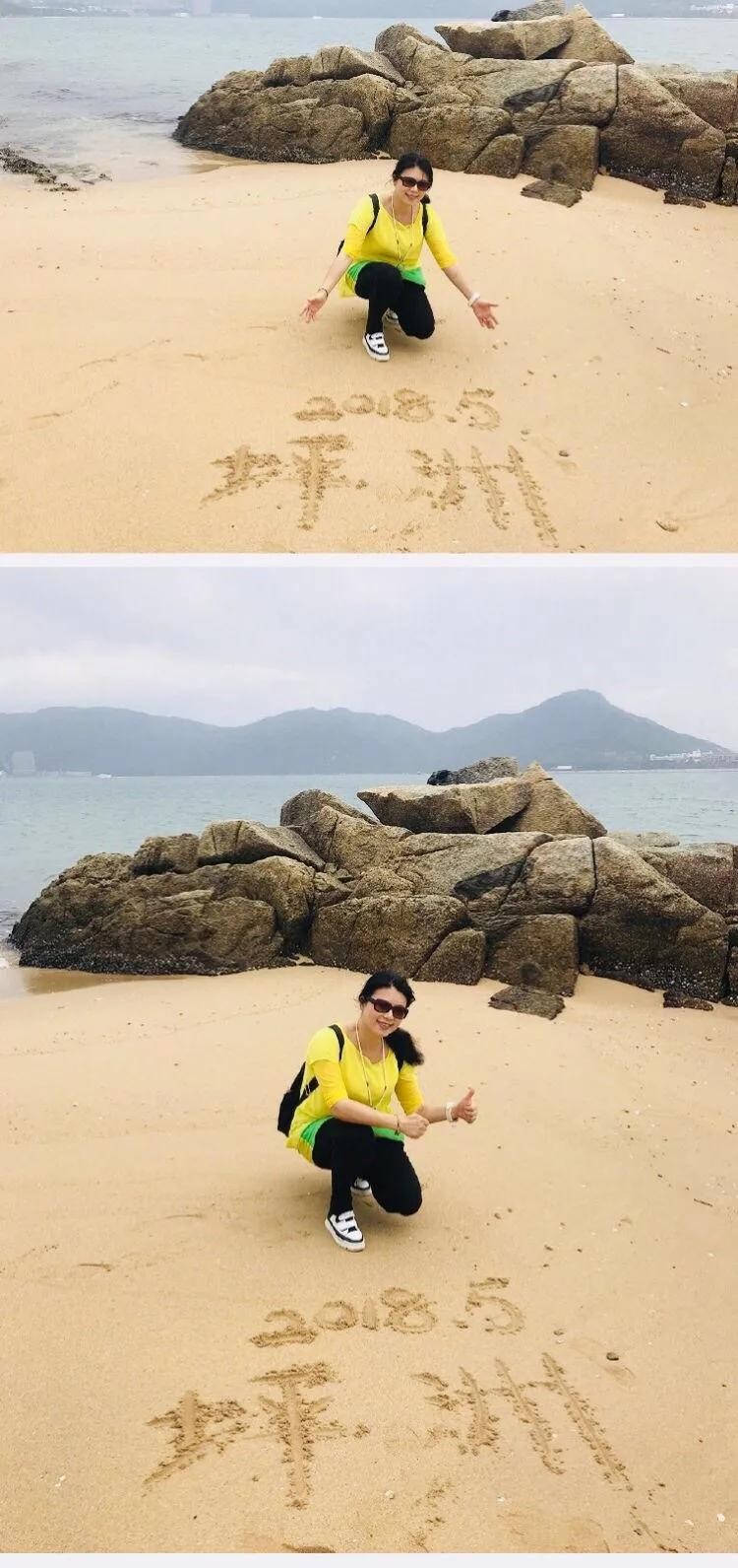 途中的一片沙滩和岩石。沙子很是细腻,走在上面一点也不扎脚。在沙子上写几个字做个纪念吧。