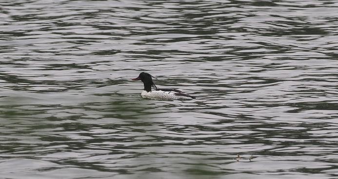 “我当时看到一只黑黑的头,没一会儿就沉到水里去了,以为是鸬鹚在捕鱼呢,等我拿望远镜一看,才发现原来是中华秋沙鸭,雄性,特别好看。”吴晓丽很激动,下意识地就举起相机按下快门,“只可惜,当时有一艘电瓶工作船靠近,中华秋沙鸭非常胆小,很快警觉起来,朝断桥方向飞走了,前后也就三四分钟时间。”