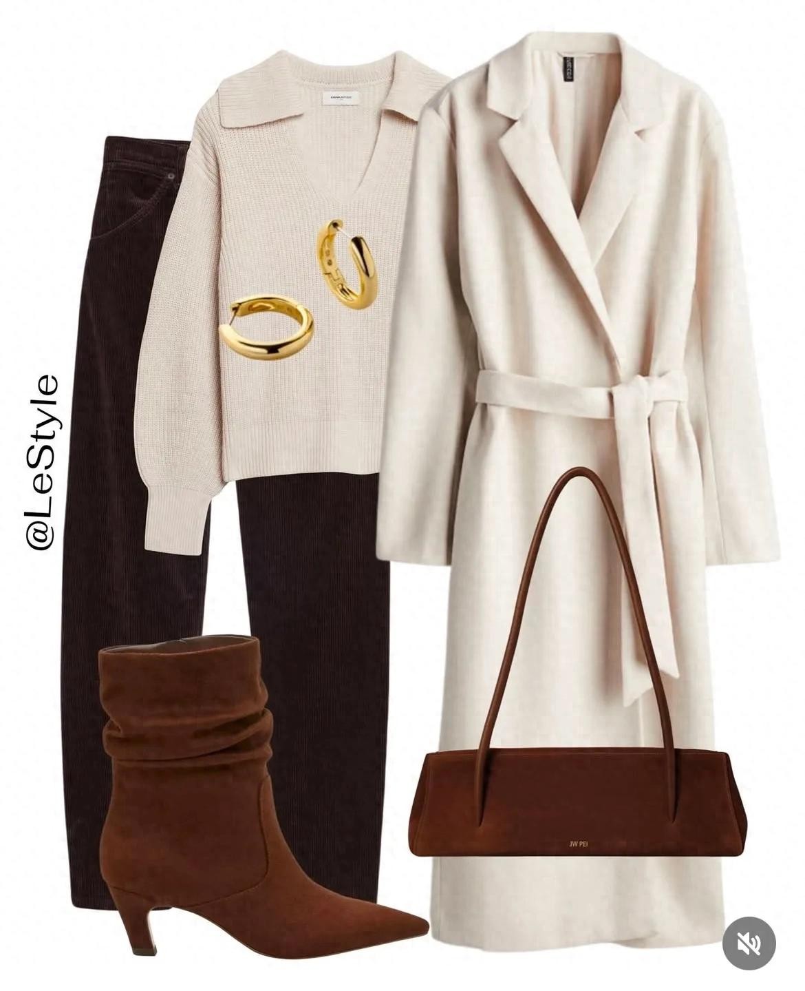 白色大衣要选窄版剪裁配腰带,长度到小腿位置,才能起到显身材又大方的效果。就用同色系大翻领毛衣呼应,再配深巧色牛仔裤,哪怕只是换不同风格的短靴,也能穿得亮眼好看,可以说是省事也时尚的搭配法了。