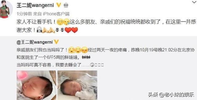 10月21日,王二妮分享了自己成功产子的喜悦,并对关心自己的网友表示了感谢,王二妮是在19日晚上九点生下宝宝的,她表示生产十分辛苦不易,她挺过了两天一夜的疼痛才生下宝宝,终于当上妈妈。