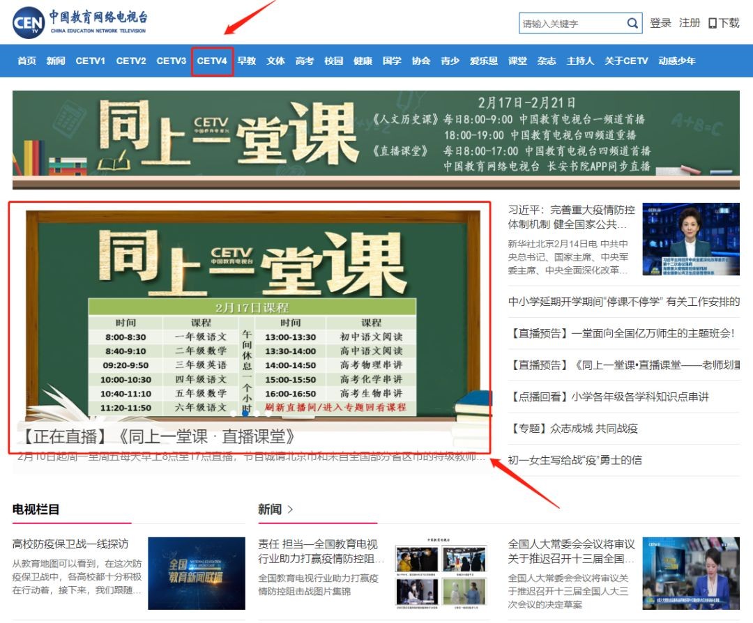 中国教育电视台四频道CETV4周一至周五推出《同上一堂课·直播课堂》,供同学们根据需要自由选择,自主学习。目前全国的电视观众可以通过有线电视网络或IPTV平台收看到中国教育电视台四频道,具体频道号请咨询当地的有线网络公司。此外在疫情防控期间,直播卫星平台特别新增传输中国教育电视台四频道讯号,户户通频道号为52,村村通频道号为55。