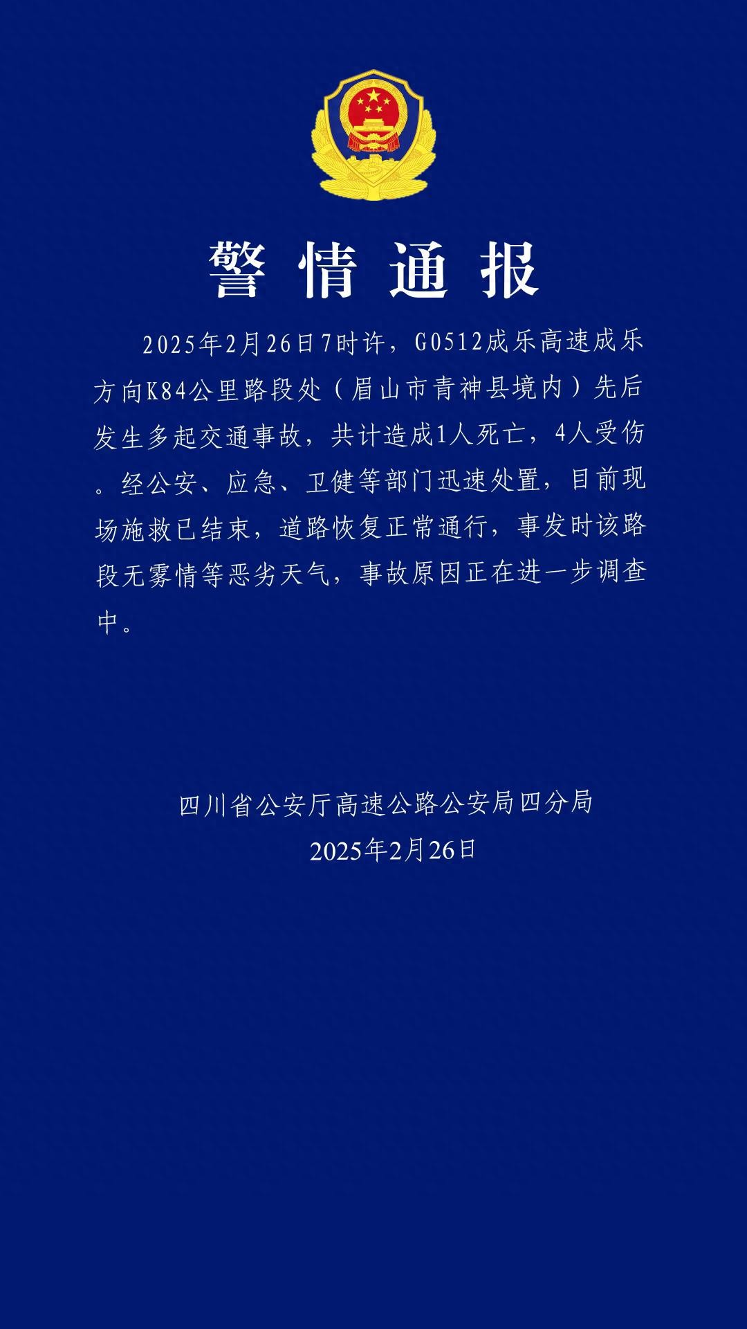 针对此事,四川省公安厅高速公路公安局四分局26日发布了警情通报。通报称,2025年2月26日7时许,G0512成乐高速成乐方向K84公里路段处(眉山市青神县境内)先后发生多起交通事故,共计造成1人死亡,4人受伤。经公安、应急、卫健等部门迅速处置,目前现场施救已结束,道路恢复正常通行,事发时该路段无雾情等恶劣天气,事故原因正在进一步调查中。