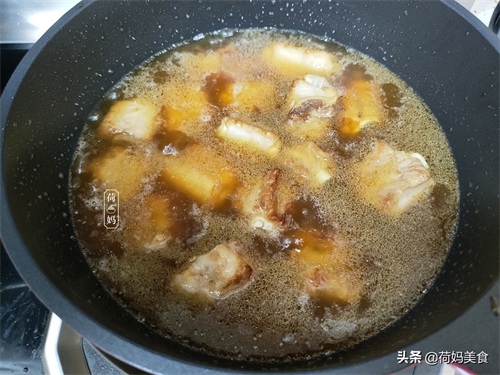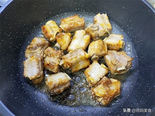 3、颜色当琥珀色时放入排骨翻炒均匀