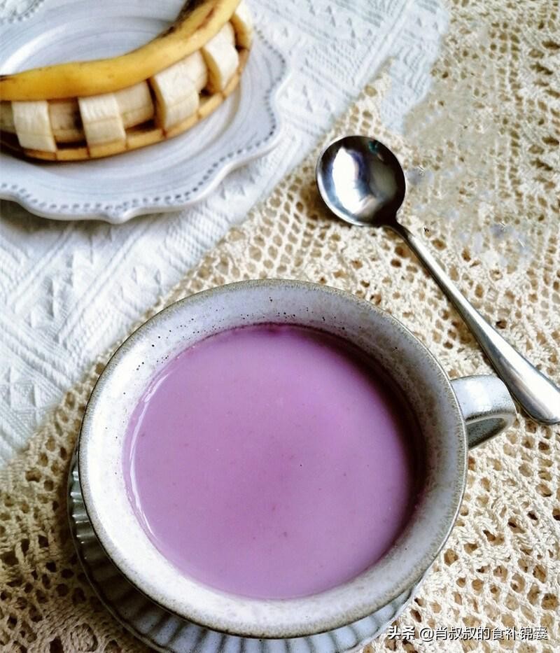 2、将浸泡过的紫薯、大米、水加入豆浆机中,制成米糊即可