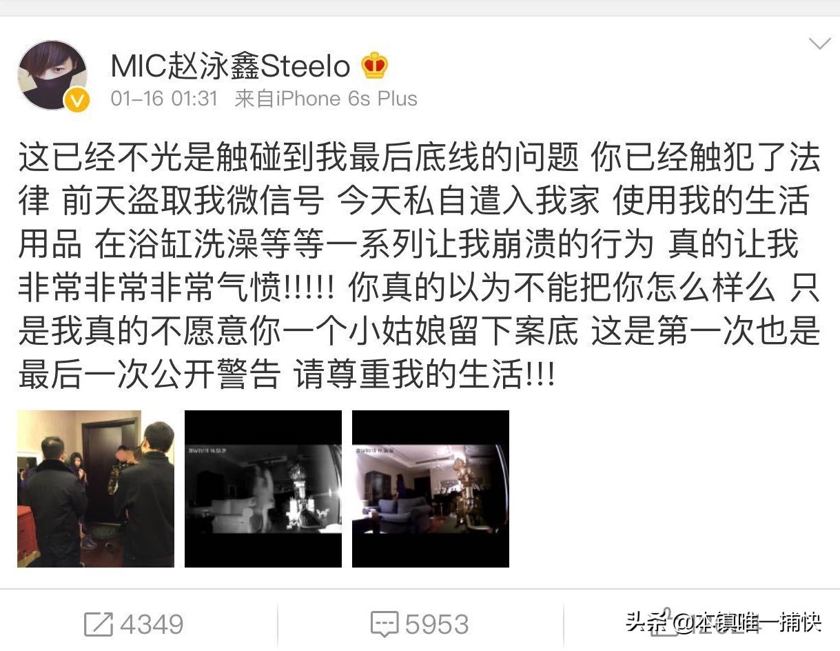 曾是MIC男团的歌手赵泳鑫,遇见了令人发指的私生饭行为,2016年,一名私生偷偷潜入了赵泳鑫的家中,不仅使用了他的私人用品,后来竟然一丝不挂的,躺在赵泳鑫家的浴缸中泡起了澡,这一切另其惊悚万分的同时忍无可忍,立刻报了警!