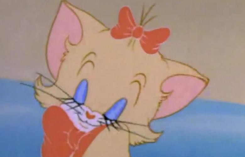 而到了查克琼斯的版本时,又出现了一只穿着围裙的白色小母猫,这只也是前后反差最大的母猫,本来最开始喜欢杰瑞喜欢的不要不要的,原来这一切的原因只是为了吃掉它!