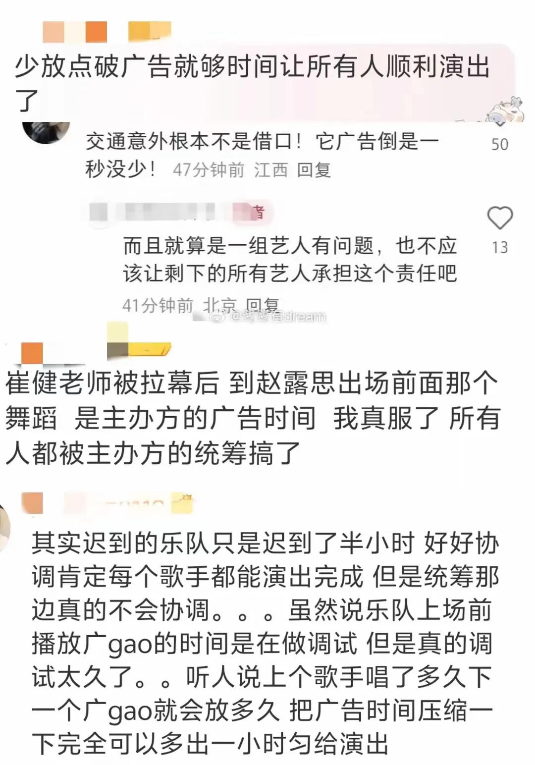 据统计,当天演出间隙广告插播超过20分钟,崔健上台前舞台黑屏了整整15分钟。有乐迷吐槽:“我花888元买票,结果看了2小时广告,1小时事故,30分钟演出——这钱够买一冰箱元气森林了!”(现场有人举牌:“还我摇滚,还我青春!”)