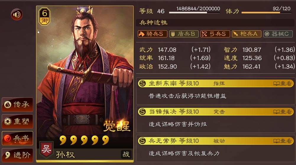 当然,如果仅仅是这样的话,也不会有那么多人去选择让孙权带兵无。最主要的是,兵无配合孙权自带战法的破阵与连击,经常会做到一个回合的爆发直接秒杀对面!