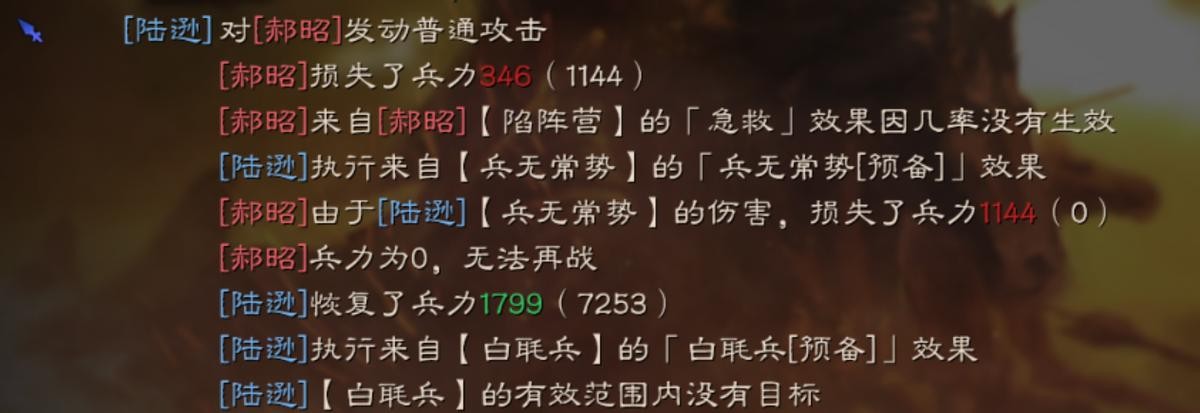 由于自身属性够优秀,并且有着奇正相生兵书的存在,陆逊可以很快的打出兵无常势的伤害以及回复。