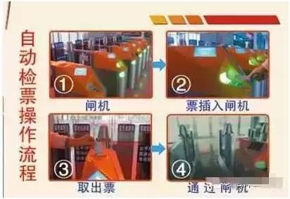 乘客按照广播提示排队检票。持蓝色磁介质车票的旅客进出站时在自动检票机(也叫闸机)上检票。检票时,应保持距离,一人一票,右手持票,将车票正面朝上对准插票口插入,符合检票条件时,显示屏出现确认显示,绿灯或黄灯亮起,车票从出票口自动弹出。旅客从闸机上方出票口拿取车票,待安全门开启后即可通过。带小孩的旅客,应该让小孩走在大人前面;携带大件行李的旅客应从宽通道通过。持红色普通车票的旅客通过人工检票通道检票进站。