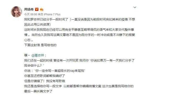 2020年4月23日,周扬青发长文承认与罗志祥已经分手。一段9年的爱情从此落下帷幕。周扬青最后说:“你如果问我后悔吗?我不后悔,因为确实是你让我变得更好了。因为爱你,我成长、成熟、也变得更独立。