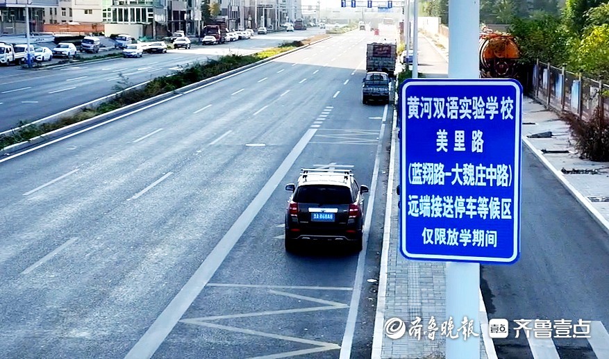 前期,天桥区大队搜集汇总5000余份调查问卷,结合民意诉求数据和学校周边实际情况,在学校周边的美里路、蓝翔路和时代总部基地停车场等区域设置“远端等候区”,供提前到达的家长临时停放;在学校门口蓝翔中路、东宇大街设置9处“近端接送区”,供家长即停即走接送学生;在校门口东西两侧50米之外设置“非机动车等候区”,规范非机动车停放,确保校门口非机动车道安全、畅通。