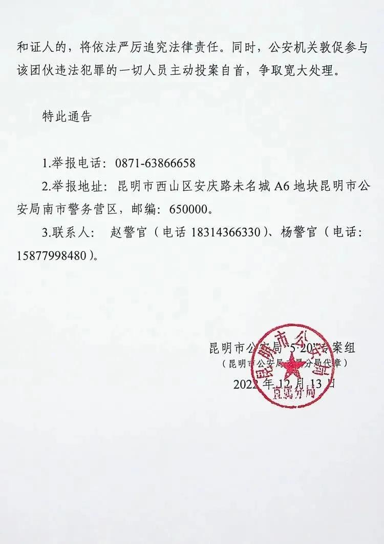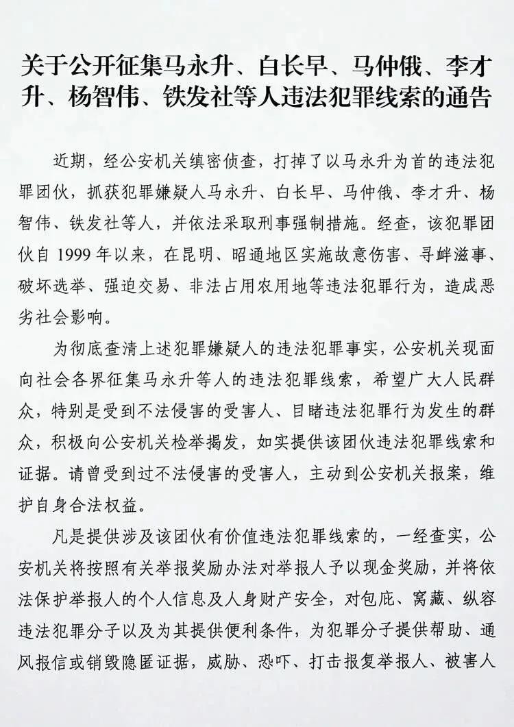 ■2022年12月13日,昆明市公安局发布公告,公开征集马永升团伙的违法犯罪线索,熟悉他的人既感到突然又觉得这是一种必然,通告说:该犯罪团伙自 1999 年以来,在昆明、昭通地区实施故意伤害、寻衅滋事、破坏选举、强迫交易、非法占用农用地等违法犯罪行为,造成恶劣社会影响。