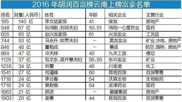 ■2015年,马永升锁芳夫妇以54亿元财富排名胡润富豪榜云南第四位,2016年以53亿元财富排名云南第四位。